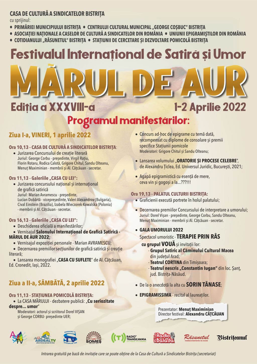 Festivalul Internațional de Satiră și Umor „Mărul de Aur” începe astăzi la Bistrița. Evenimentele vor avea loc la Galeriile Casa cu Lei și la Pal...