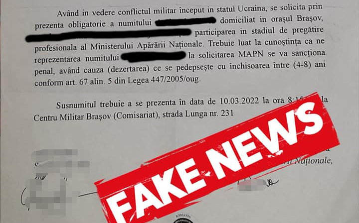 Vă semnalăm noi tentative de răspândire de documente și informații false în legătură cu așa-zise demersuri ale MApN pentru pregătirea mobilizării...