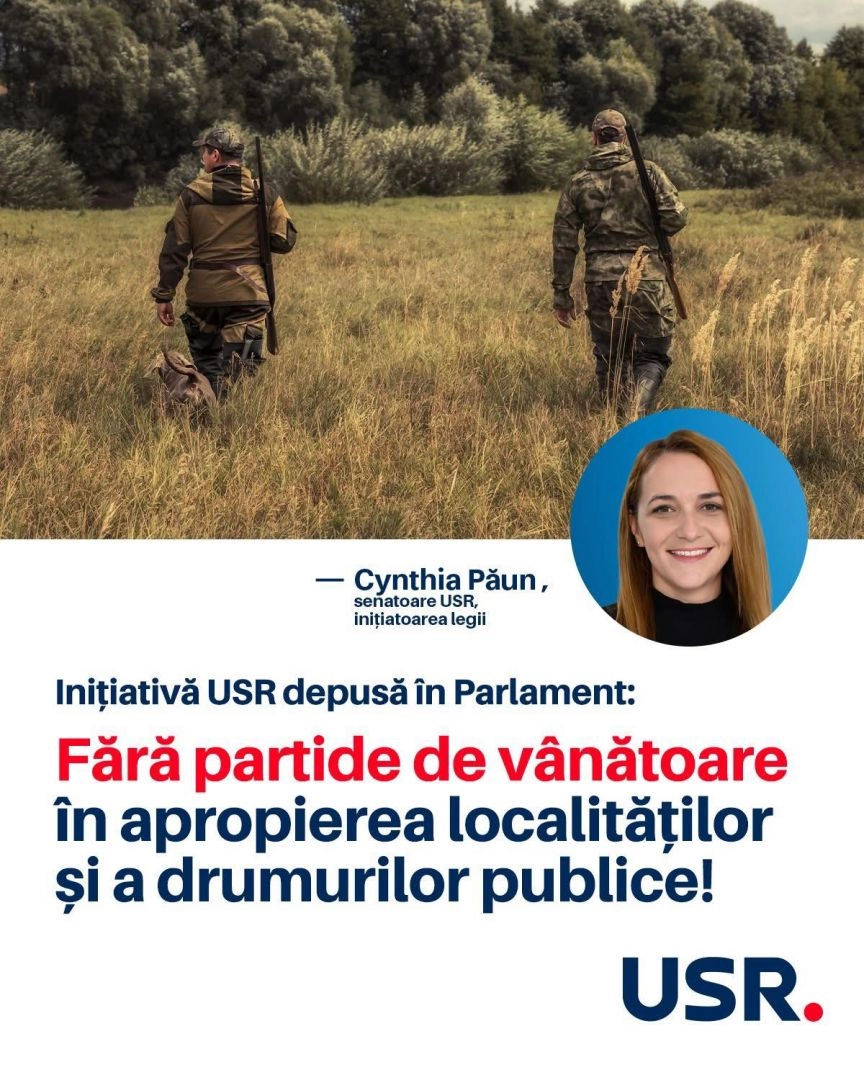 Fără partide de vânătoare în apropierea localităților și a drumurilor publice! Senatoarea USR Cynthia Păun a depus o inițiativă legislativă care...
