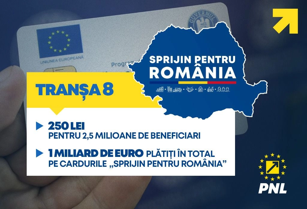 A opta tranșă din ”Sprijin pentru România” a fost livrată în conturile a 2,5 milioane de români. Cei 250 de lei pot fi utilizați pentru achiziția...