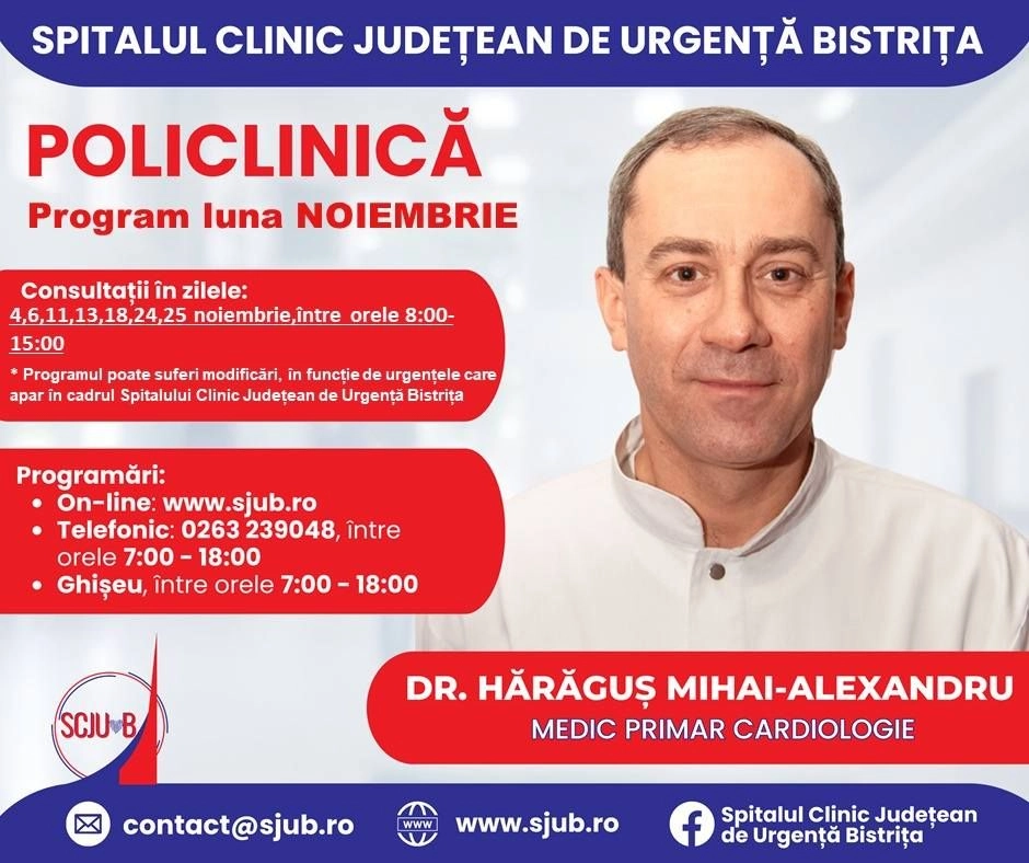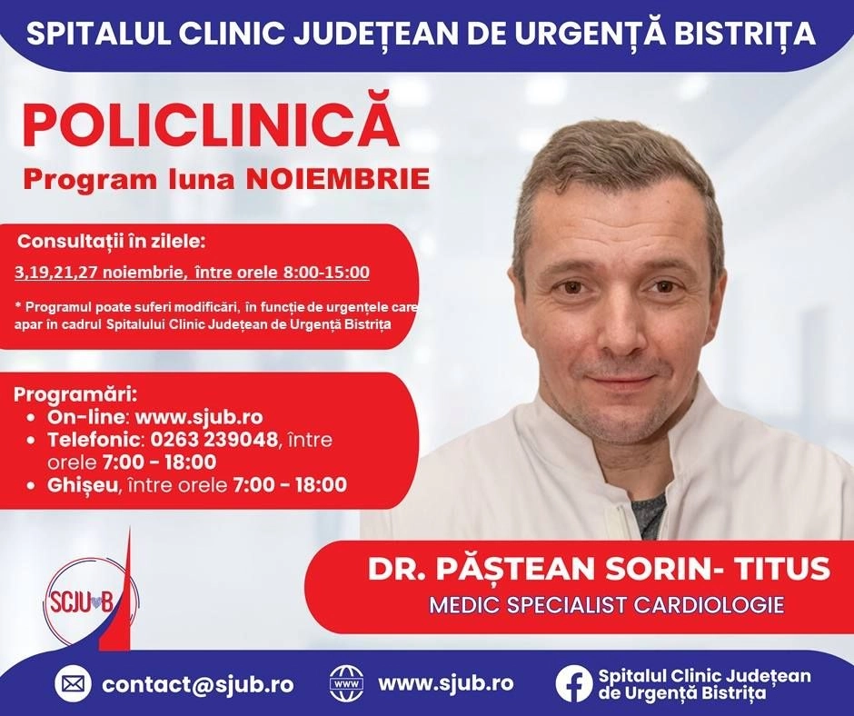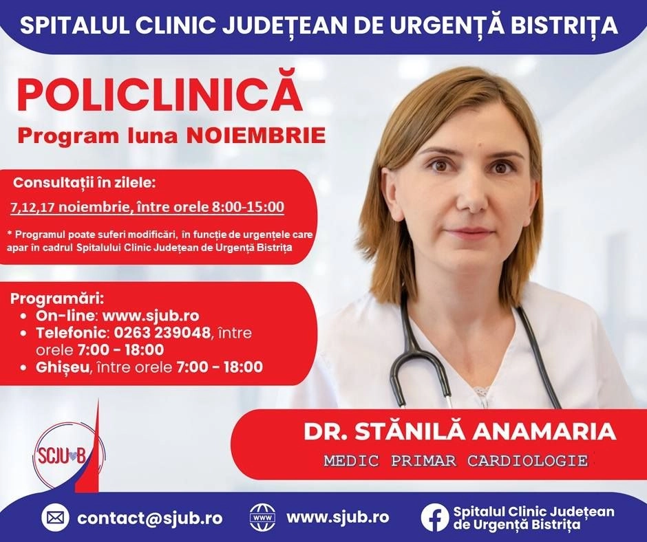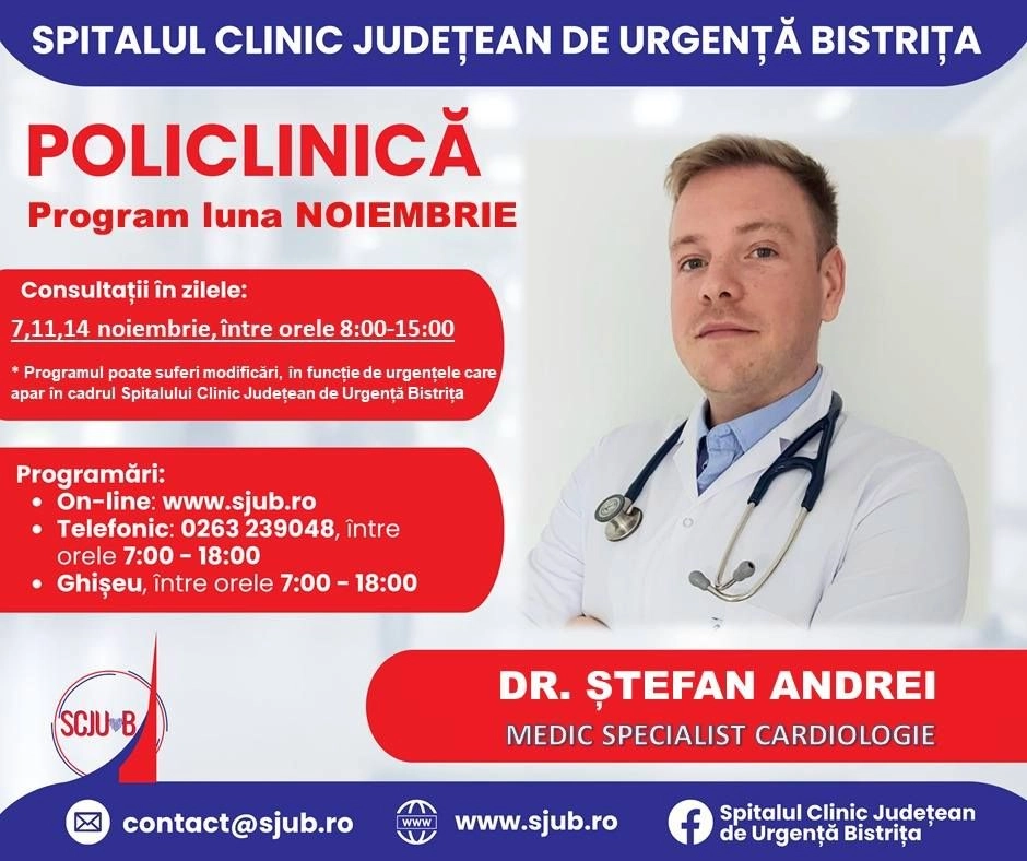 Începând de mâine, 29 octombrie, la Policlinica Bistrița vor fi deschise programările lunii noiembrie la specialitatea Cardiologie.