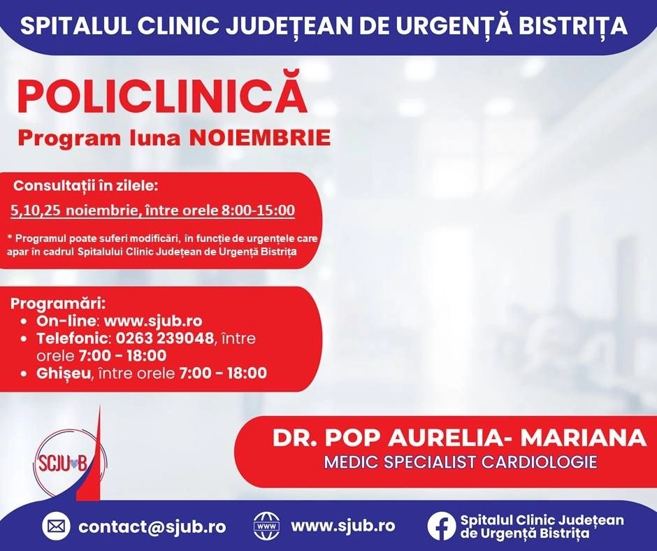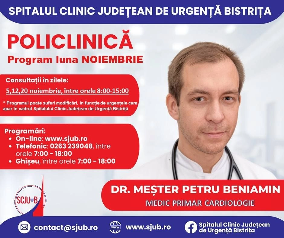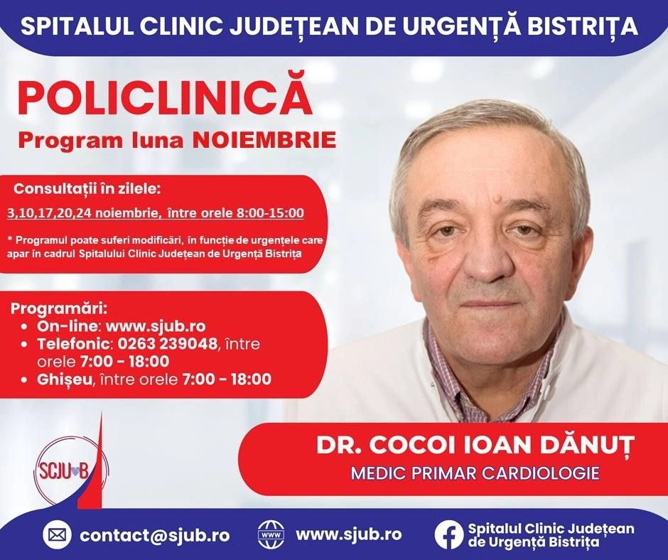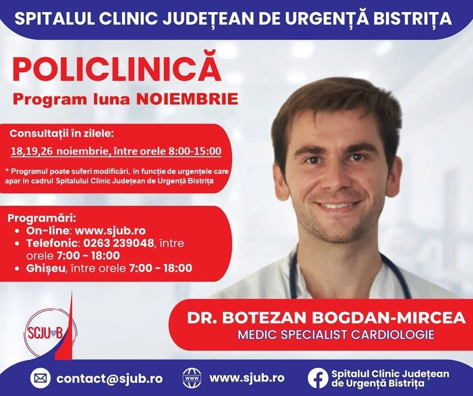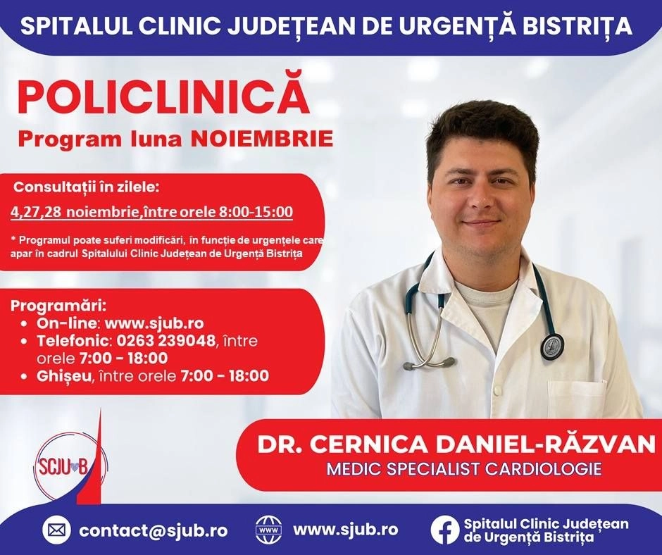Începând de mâine, 29 octombrie, la Policlinica Bistrița vor fi deschise programările lunii noiembrie la specialitatea Cardiologie.