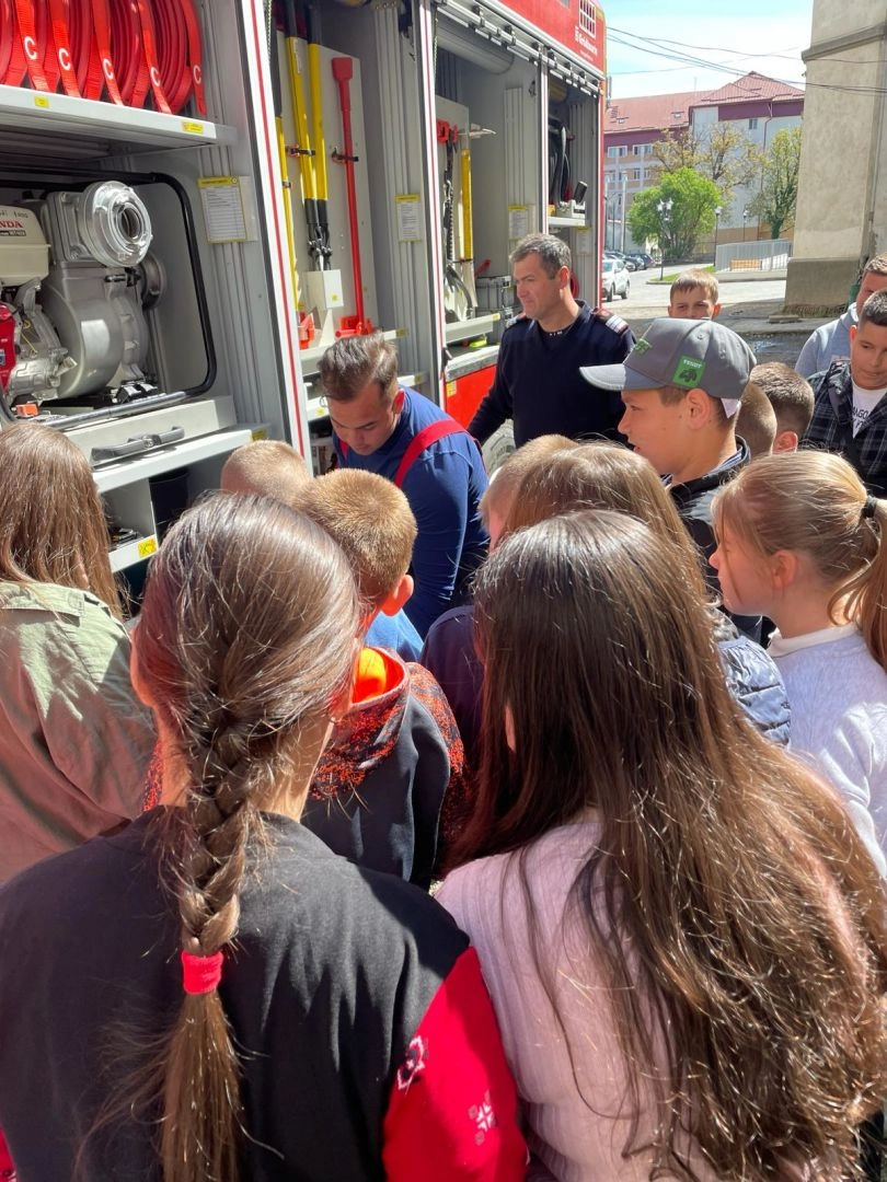 Elevii au avut ocazia să fie mai aproape de salvatori, să le cunoască îndeaproape autospecialele de intervenție, dar și să folosească accesoriile pe care pompierii bistrițeni le folosesc în misiunile specifice.