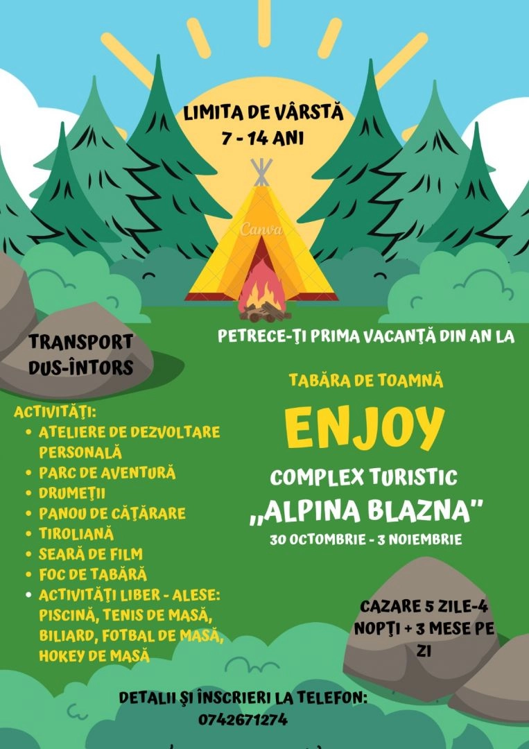 Copiii cu vârste între 7 și 14 ani pot participa la tabăra de toamnă, care va avea loc în vacanța din perioada 30 octombrie - 3 noiembrie. Tabăra se va desfășura la Complexul Alpina Blazna din Bistrița-Năsăud.