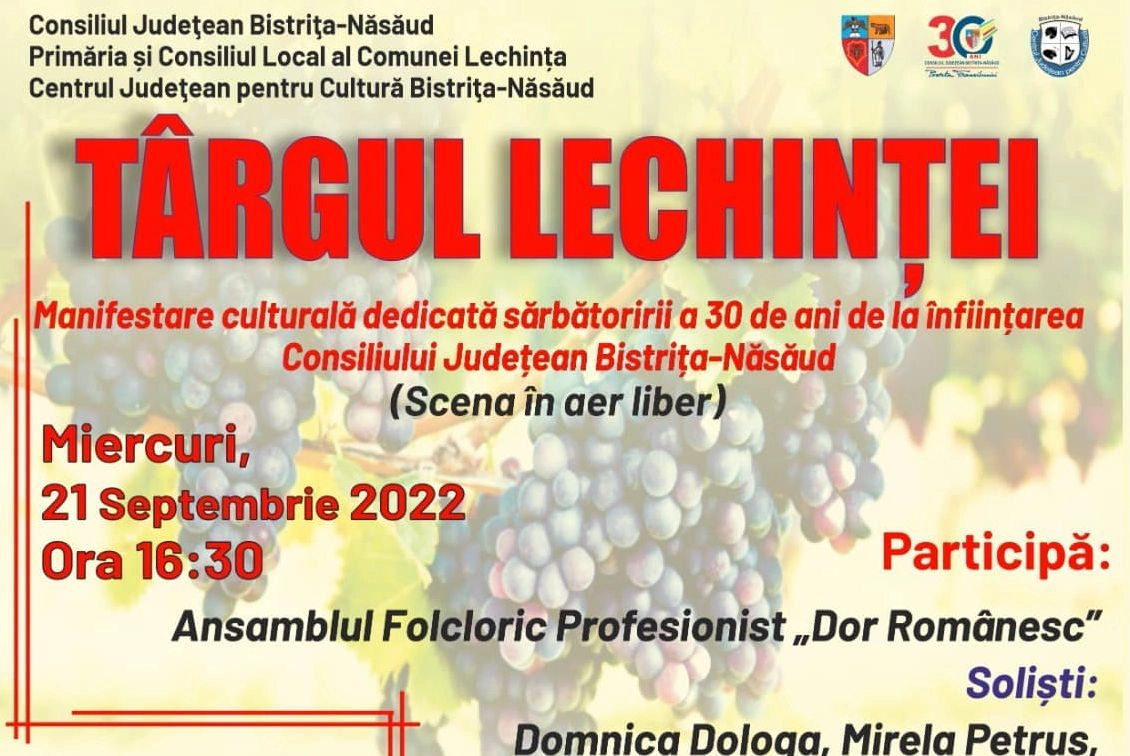 Târgul Lechinței va avea loc miercuri, 21 septembrie, cu începere de la ora 16.30, manifestările fiind dedicate aniversării a 30 de ani de la înființarea Consiliului Județean.