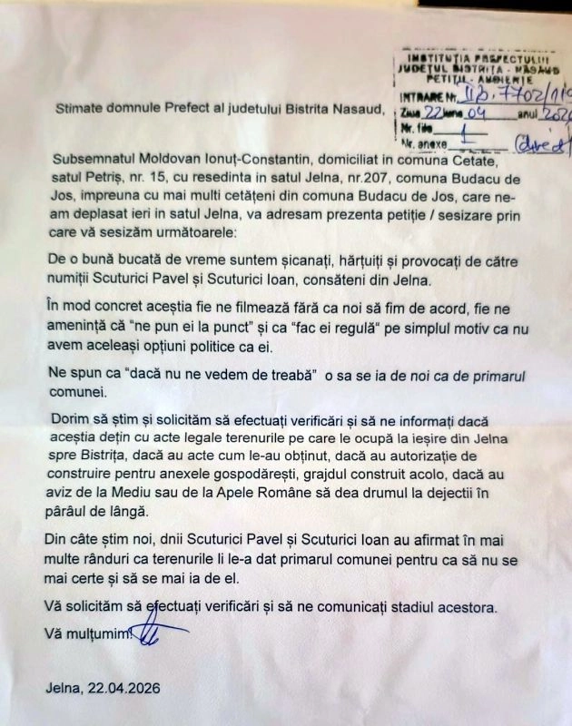 În același document oficial, semnatarii solicită autorităților să efectueze verificări privind legalitatea unor terenuri ocupate de cei doi bărbați la ieșirea din localitatea Jelna spre Bistrița. Există suspiciuni că aceste terenuri nu le-ar aparține în mod legal, iar subiectul ar fi fost folosit ca instrument de presiune în relația cu administrația locală.