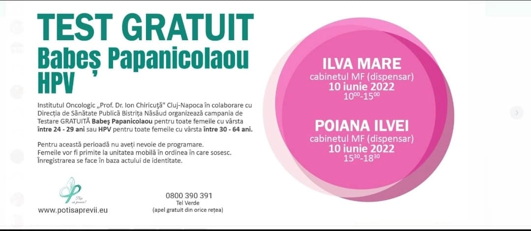 - Vineri, 10 iunie 2022, între orele 15, 30- 18,30, în Poiana Ilvei, la cabinetul de medicina de familie (dispensar).