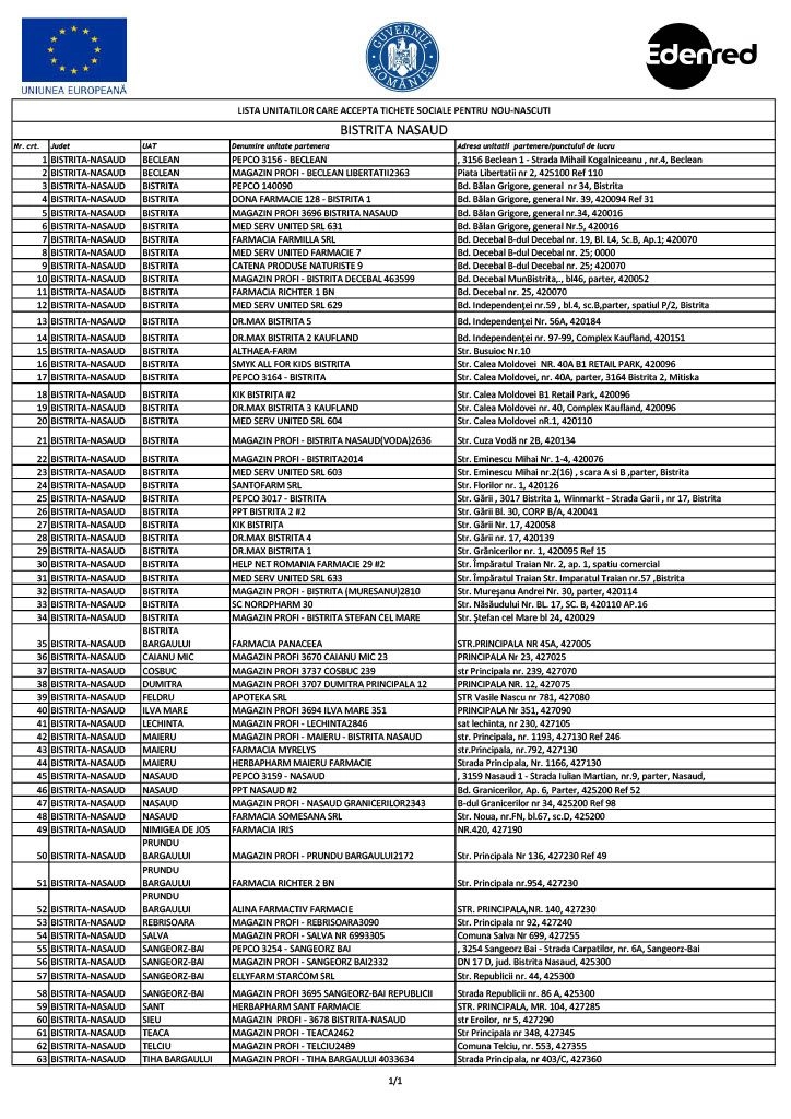 Lista unităților afiliate unde pot fi utilizate cardurile destinate cuplurilor mama-nou născuți poate fi consultată mai jos: