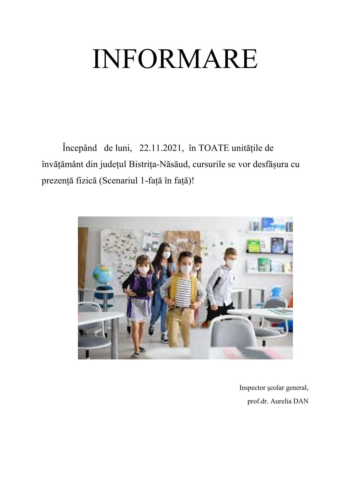 Toate unităţile de învăţământ din judeţul Bistriţa-Năsăud şi-au reluat, de luni, activitatea cu prezenţa fizică a elevilor şi preşcolarilor, potrivit anunţului făcut de Inspectoratul Şcolar Judeţean (IŞJ) pe pagina de socializare a instituţiei.