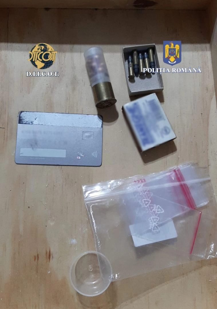 Astfel, au fost descoperite și ridicate, în vederea continuării cercetărilor, 60 de grame de substanță cristalină de culoare albă, 5 grame de substanță vegetală de culoare verde oliv, o țigară artizanală, o cutie cu 18 pastile triunghiulare de culoare aurie, obiecte cu urme de substanță pulverulentă albă și vegetală, precum și 37 de cartușe de diferite calibre și dimensiuni, 12 telefoane mobile și alte mijloace de probă.
