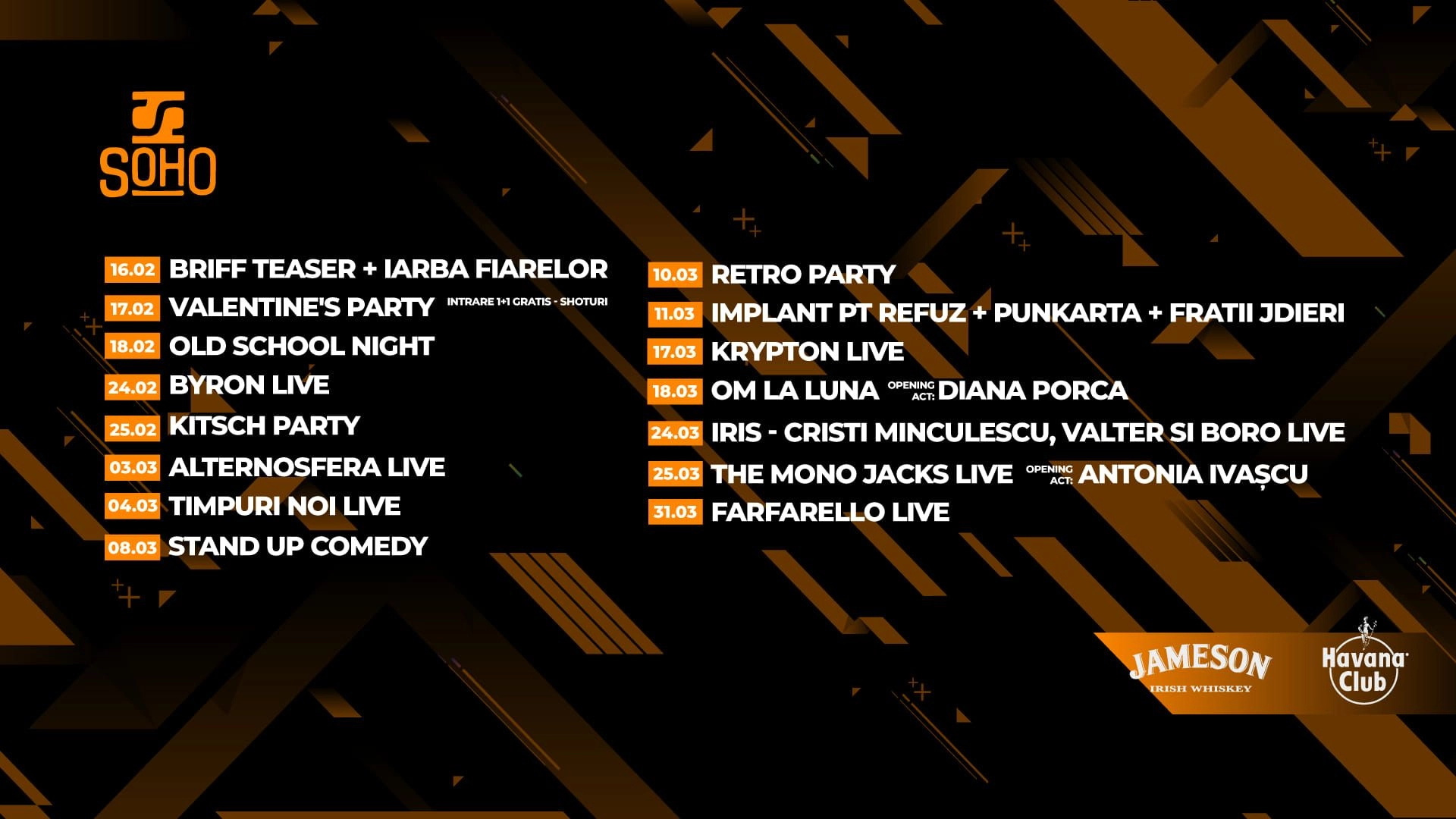 În perioada următoare, Soho Music Hall va organiza mai multe concerte, cu formații importante din România. Vor concerta la Bistrița Iris, The Monojacks, Implant pentru Refuz, Om la lună, Timpuri Noi și alții.