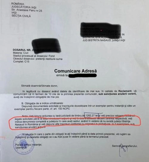 Judecătorul titular al completului C15 de la Judecătoria Iași i-a dispus reclamantului, în rezoluția trimisă prin adresă de grefier, să timbreze acțiunea cu taxa judiciară de timbru și ”veți indica denumirea completă a județului în care aveți sediul, având în vedere că nu există județul Bistrița Nasaud în România și veți depune alte înscrisuri conforme cu originalul în probațiune”, scrie clujust.ro.