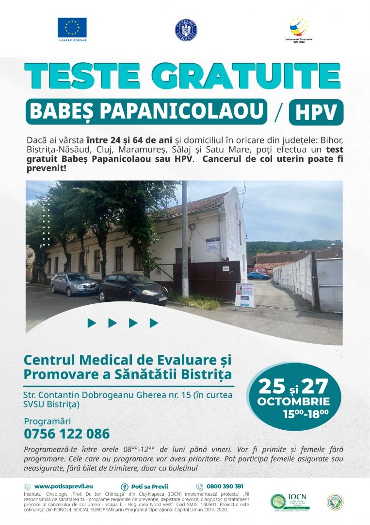 În zilele de 25 si 27 Octombrie între orele 15:00 – 18:00 se realizează teste gratuite Babeș Papanicolaou sau HPV la Centrul Medical de Evaluare și Promovare a Sănătății Bistrița, Str. Dobrogeanu Gherea 15, tel: 0756 122 086.