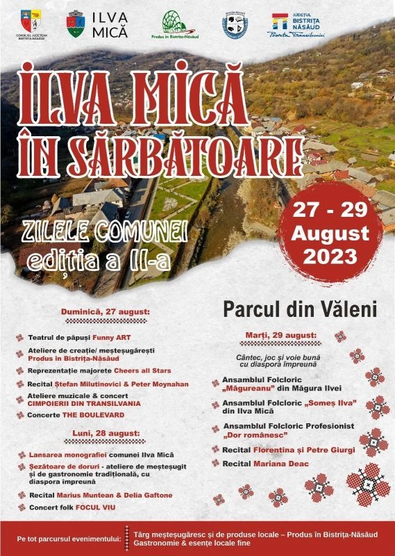 Zilele Comunei Ilva Mică vor avea loc în perioada 27-29 august, în Parcul din Văleni. Localnicii din Ilva Mică, dar și cei reîntorși acasă din țări străine, vor avea parte de un program artistic pentru toate vârstele, ateliere, târg meșteșugăresc și gastronomie locală.