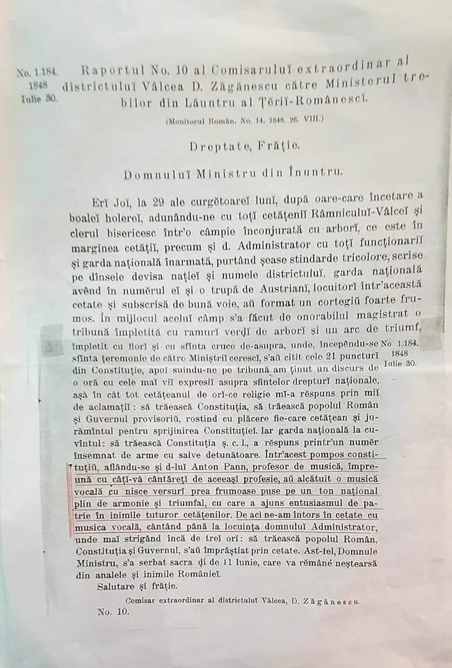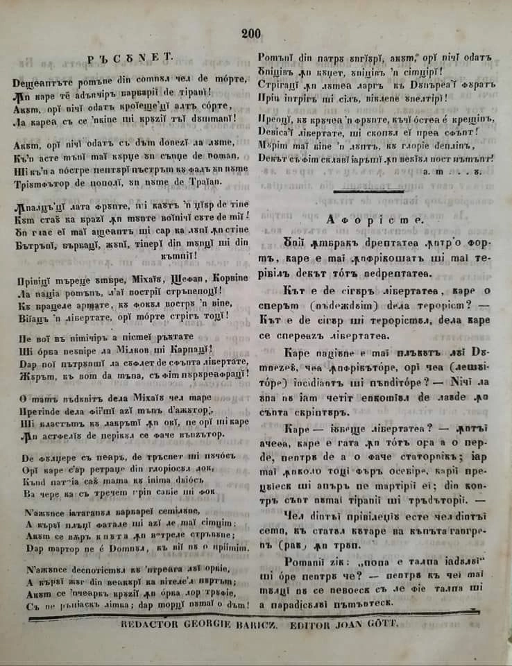 Motto: „ Înaintea ochilor mei stă ziua-noaptea PLEBEA, poporul cel de rând , de a cărui înaintare in cultură , bunăstare și înflorire materială și spirituală, m-aș bucura din adâncul sufletului și încă în aceeași măsură , în care mă întristez astăzi , văzându-l zăcând în noptaticul întunerec al minții, lipsit de tot feliul de cunoștință , atât în privire sufletească , cât si trupească , prin urmare, expus la râpa pierirei, ce în scurt timp poate să urmeze, el este – după puțin însemnătoarea mea părere – acea parte constitutivă la trupul unei nații, de la a cărei cultură sau orbire , însuflețire sau amorțire, viață sau moarte, atârnă pentru totdeauna apunerea sau rădicarea, înflorirea sau cotropirea întregii nații.” (ANDREI MURESANU- Gazeta de Transilvania, VIII, 1845) Andrei Mureșanu a lucrat ca profesor la Brașov și a început să publice poezii și articole în ”Foaie pentru minte, inimă și literatură”, o revistă românească cu caracter cultural, supliment al ziarului “Gazeta de Transilvania”. Poemul său intitulat “Un răsunet”, a fost scris la Brașov si versurile au fost puse pe melodia anonimă a unui vechi imn religios (Din sânul maicii mele), devenind marșul revoluționarilor români din 1848 din Transilvania, fiind numit de Nicolae Bălcesu ”Marseilleza românilor”. Denumit ulterior ”Deșteaptă-te, române !”, poemul – alcătuit din 11 strofe – a devenit, din 1990, imnul de Stat al României, iar la ocaziile festive se interpretează doar strofele 1, 2, 4 și 11. Ziua imnului naţional al României a fost instituită în anul 1998, prin Legea nr. 99/1998, care prevede că această zi va fi sărbătorită în fiecare an la 29 iulie, dată la care, în anul 1848, ''Deşteaptă-te române!'' a fost cântat pentru prima dată oficial, în Parcul Zăvoi din Râmnicu Vâlcea. Un răsunet / Deşteaptă-te, române! de Andrei Mureșanu 1. Deşteaptă-te, Române, din somnul cel de moarte, În care te-adânciră barbarii de tirani! Acum ori niciodată croieşte-ţi altă soarte, La care să se-nchine şi cruzii tăi duşmani! 2. Acum ori niciodată să dăm dovezi la lume Că-n aste mâni mai curge un sânge de roman, Şi că-n a noastre piepturi păstrăm cu fală-un nume Triumfători în lupte, un nume de Traian! Înalţă-ţi lata frunte şi cată-n giur de tine, Cum stau ca brazi în munte voinici sute de mii; Un glas ei mai aşteaptă şi sar ca lupi în stâne, Bătrâni, bărbaţi, juni, tineri, din munţi şi din câmpii! 4. Priviţi, măreţe umbre, Mihai, Ştefan, Corvine, Româna naţiune, ai voştri strănepoţi, Cu braţele armate, cu focul vostru-n vine, ”Vieaţă-n libertate ori moarte!” strigă toţi. Pre voi vă nimiciră a pizmei răutate Şi oarba neunire la Milcov şi Carpaţi! Dar noi, pătrunşi la suflet de sânta libertate, Jurăm că vom da mâna, să fim pururea fraţi! O mamă văduvită de la Mihai cel Mare Pretinde de la fiii-şi azi mână d-ajutori, Şi blastămă cu lacrămi în ochi pe orişicare, În astfel de pericul s-ar face vânzători! De fulgere să piară, de trăsnet şi pucioasă, Oricare s-ar retrage din gloriosul loc, Când patria sau mama, cu inima duioasă, Va cere ca să trecem prin sabie şi foc! Ne-ajunse iataganul barbarei semilune, A cărui plăgi fatale şi azi le mai simţim; Acum se vâră cnuta în vetrele străbune, Dar martor ne e Domnul că vii nu o primim! Ne-ajunge despotismul cu-ntreaga lui orbie, Al cărui jug din seculi ca vitele-l purtăm; Acum se-ncearcă cruzii, în oarba lor trufie, Să ne răpească limba, dar morţi numai o dăm! Români din patru unghiuri, acum ori niciodată Uniţi-vă în cuget, uniţi-vă-n simţiri! Strigaţi în lumea largă că Dunărea-i furată Prin întrigă şi silă, viclene uneltiri! 11. Preoţi, cu crucea-n frunte, căci oastea e creştină, Deviza-i libertate şi scopul ei prea-sfânt. Murim mai bine-n luptă, cu glorie deplină, Decât să fim sclavi iarăşi în vechiul nost’ pământ! (21 iunie, 1848 - În “Foaie pentru minte, Inimă și literatură”)